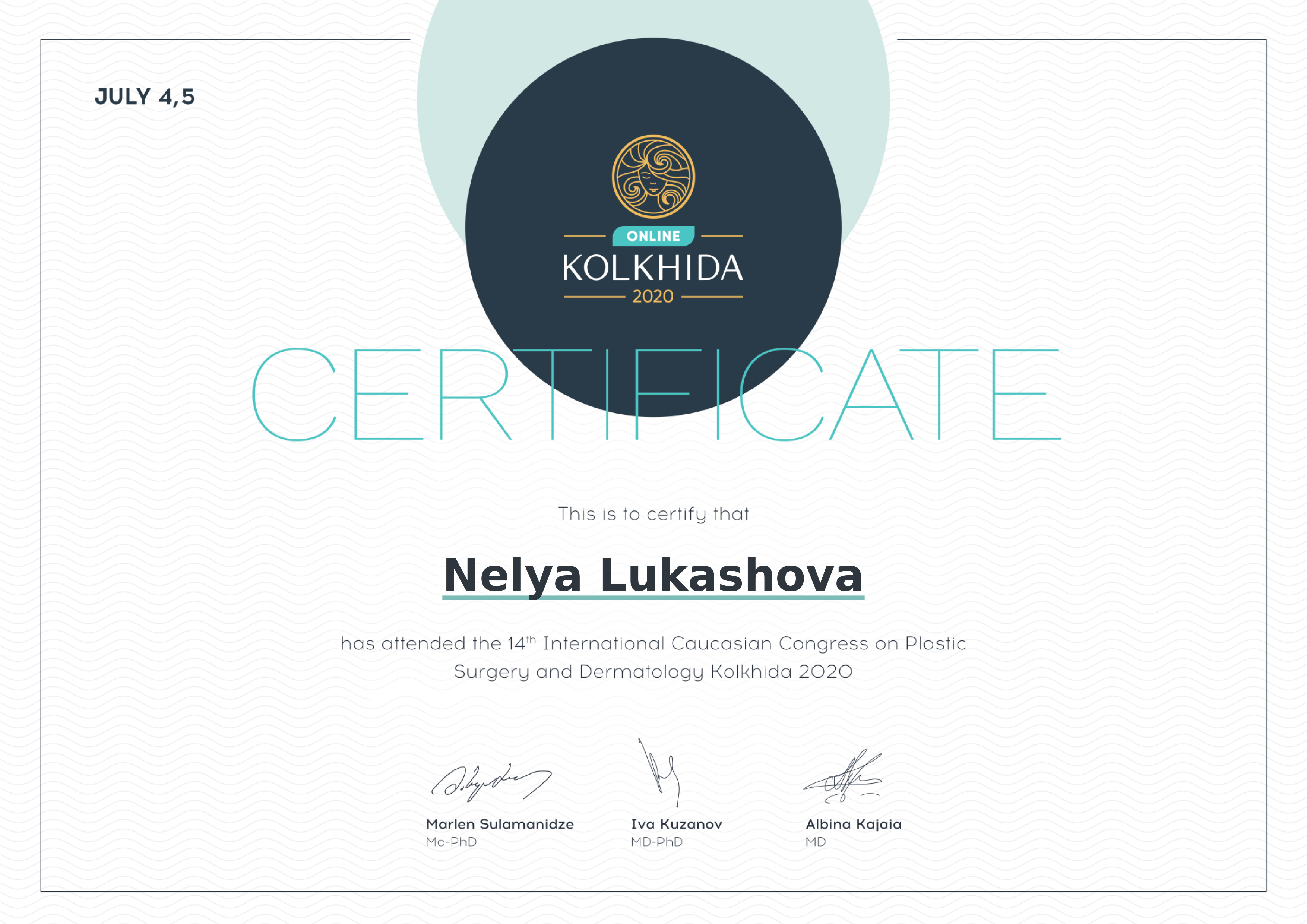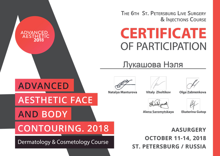- Повышение квалификации по современным аспектам «Дерматокосметологии», 2015 г.