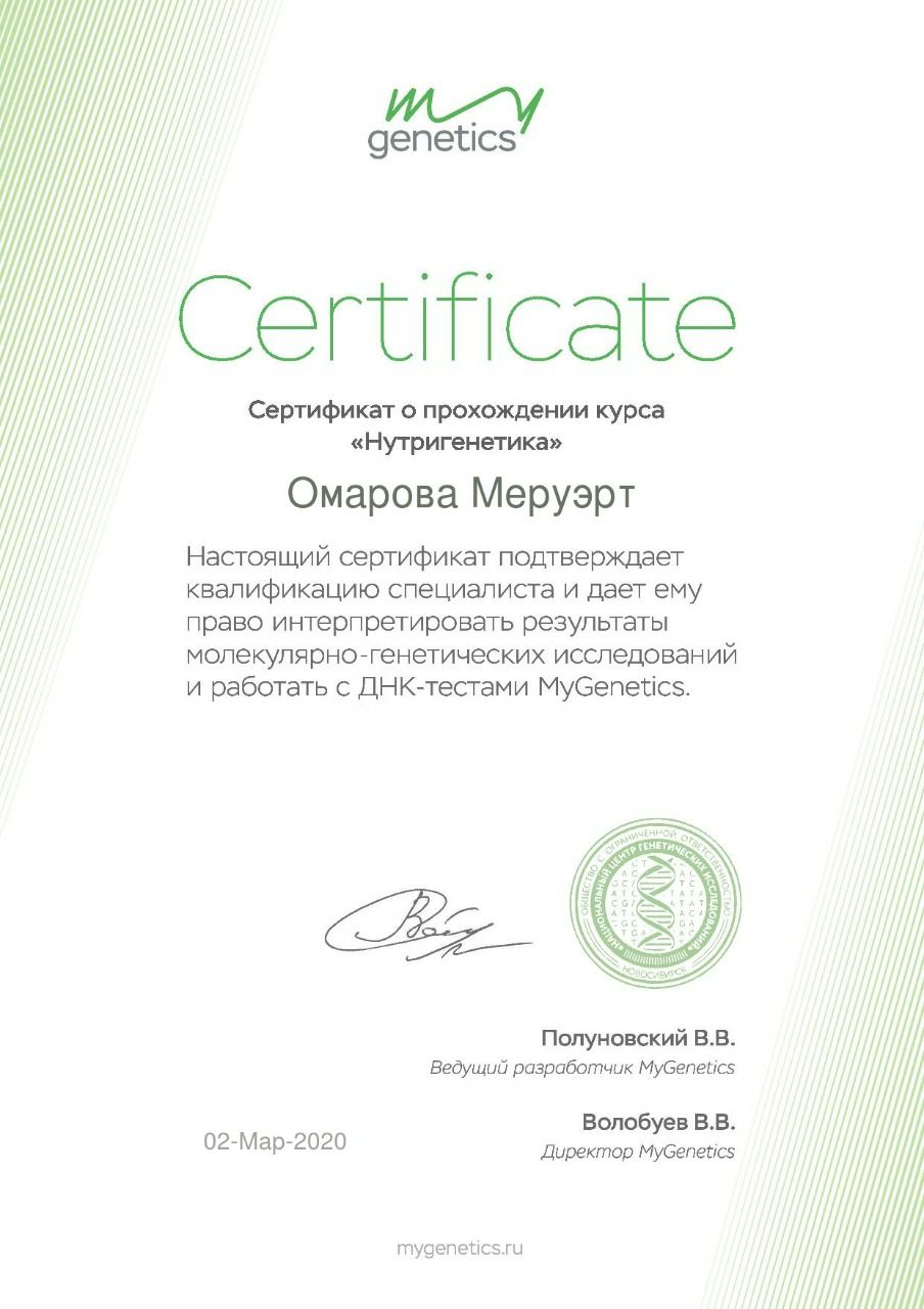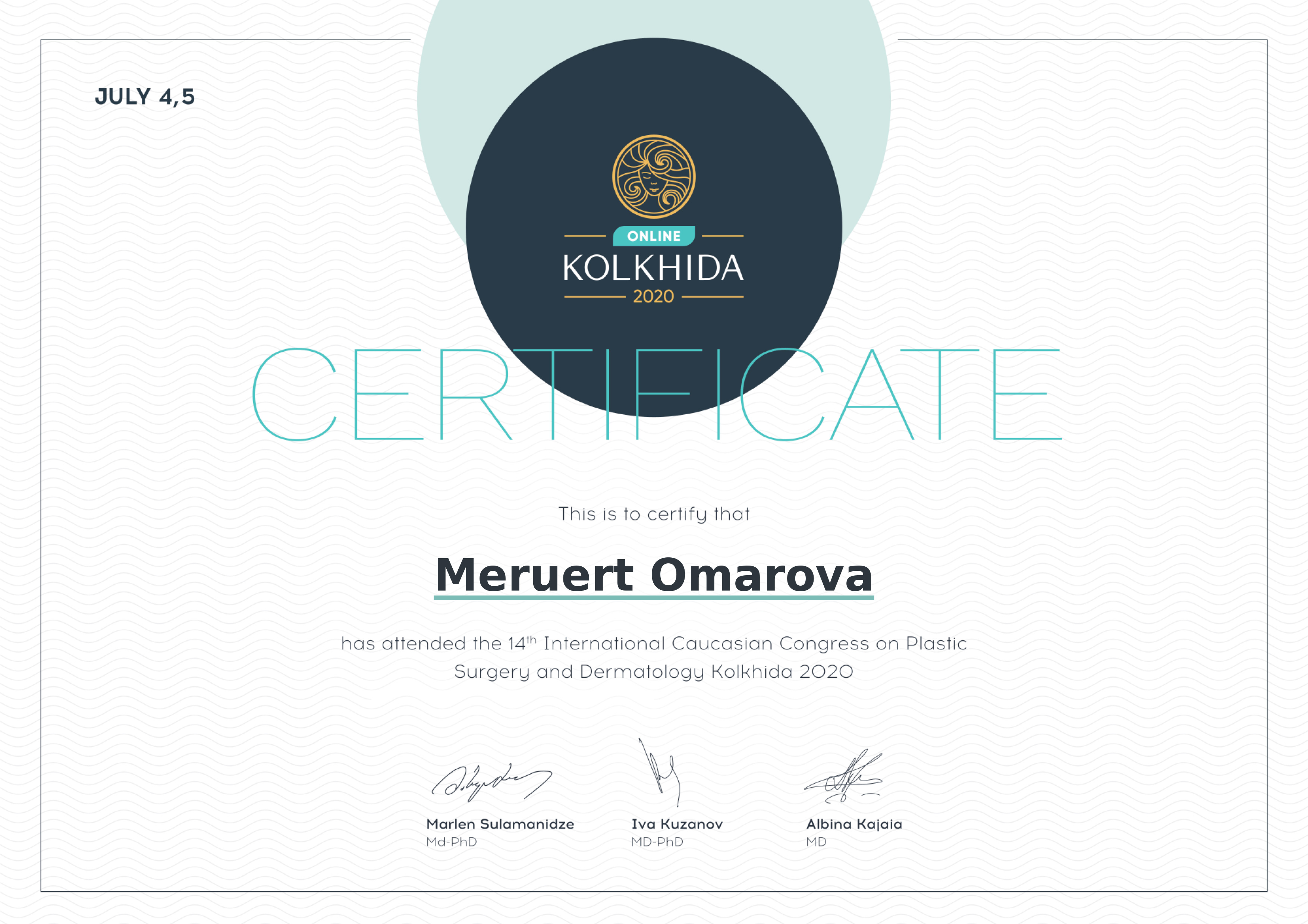 - Переподготовка по специальности «Дерматовенерология», «Дерматокосметология». Каз НМУ им. С. Д. Асфендиярова, 2012—2013 гг.